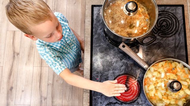 Будьте осторожны, когда готовите на плите или используете духовку. Поверните ручки кастрюль к задней части плиты, чтобы ребенок не мог дотянуться и дернуть за них.