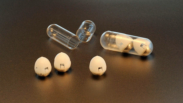 Капсулы для доставки лекарств на основе сложных белков были представлены летом 2021 года. Основной компонент выглядит как яйцо с иголкой на толстой части. Такая его форма позволяет всегда втыкаться в ткани желудка. После инъекции игла втягивается внутрь капсулы, и все устройство выходит из организма по пищеварительному тракту.